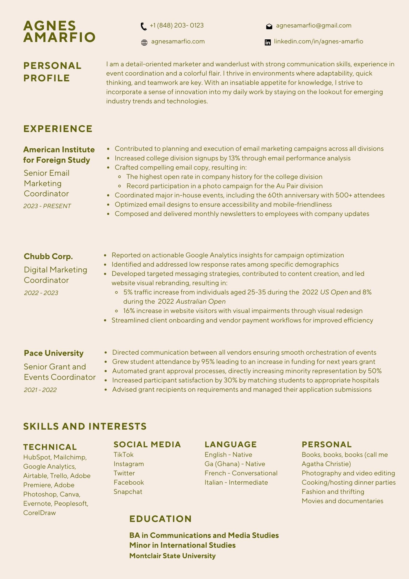 As the Email Marketing Coordinator at AIFS, I played a key role in crafting and executing email campaigns across all divisions, contributing to a 13% increase in signups for January term programs in the College division. My targeted messaging strategy led to the highest open rates in company history for the College division and record participation in the Au Pair division's photo campaign. I also ensured email designs were optimized for accessibility and mobile-friendliness, and helped plan major events, including the company’s 60th anniversary celebration with over 500 attendees.